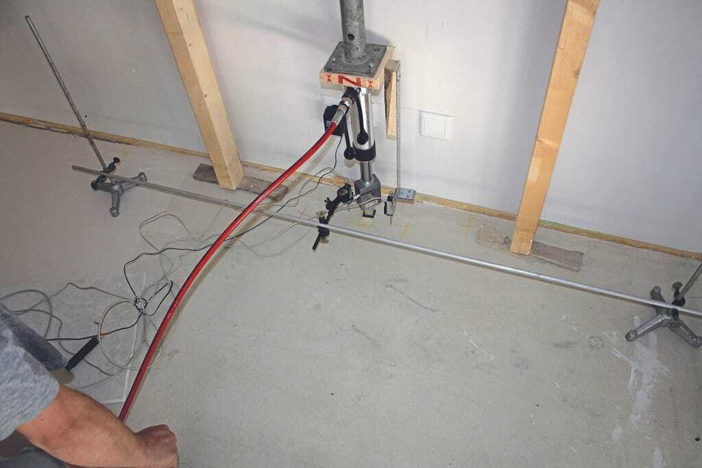 Als Alternative zur „Prüfstreifenmethode“ nach [1] wird seit geraumer Zeit in Sachverständigenkreisen das „Einzellastprüfungsverfahren“ diskutiert und auch schon nach vorheriger Vereinbarung zwischen den Parteien angewendet. Es handelt sich hierbei um ein bereits aus dem Bereich „Hohlböden“ bekanntes Prüfungsverfahren. Dieses Verfahren ermöglicht auch eine Tragfähigkeitsprüfung von Estrichen auf Dämmung unter Berücksichtigung der Dämmstoffeigenschaften. Hierbei wird eine Hydraulikpresse, die an der Decke abgestützt ist, auf die zu prüfende Stelle des Estrichs aufgebracht. Anschließend erfolgt die Belastung mit einem quadratischen Metallstempel von 50 x 50 mm, wie in [2, Pkt. 6.3.1.2] beschrieben. Obwohl das genannte Verfahren mit dem quadratischen Metallbelastungsstempel in [1] unter Punkt 4.2.1.1 zwar als zu erfüllende Belastung mit Lasten von 1 KN bis 4 KN in Tabelle 1 erwähnt, jedoch vom Verfahrensablauf unter Punkt 7.2.3 - Prüfung der Biegezugfestigkeit - nicht geregelt ist, ist es vorab zwischen den Parteien zu vereinbaren.