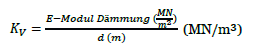 Für die Berechnungen und Einordnung in die Tabelle 1 ist die vertikale Bettungsziffer KV–Wert (in MN/m³) von Bedeutung. Die Bettungsziffer gibt die elastische Verformbarkeit des Untergrunds an, in diesem Fall der Dämmung. Sie wird vereinfacht als elastisch angenommen.