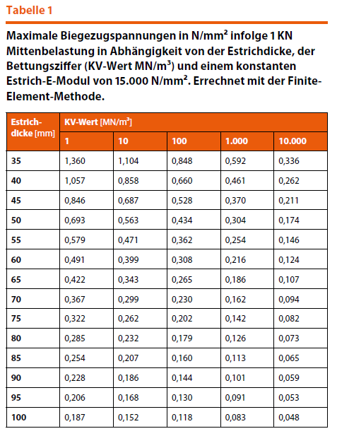 Ein kurzes Berechnungsbeispiel soll die Unterschiede noch zahlenmäßig darstellen: Wenn ein 50 mm dicker Estrich mit einer sehr weichen Dämmung (K-Wert = 1 MN/m³) mit einem 1 KN-Stempel in der Mitte (siehe Tabelle 1) belastet wird, treten Biegezugspannungen von 0,693 N/mm² auf. Bei einer (mittel-) harten Dämmung (K-Wert = 1000 MN/m³), betragen die Estrichbiegezugspannungen lediglich 0,304 N/mm², also knapp die Hälfte. Im Vergleich dazu erzeugt eine 1 KN-belastete Balkenkonstruktion Biegezugspannungen von 2,500 N/mm², also das 3,6- bis 8,2-fache. Im Gegensatz zu Balken haben einzelne Schwachstellen in einem flächig gelagerten Plattentragwerk aufgrund möglicher Spannungsumleitungen zudem eine weniger gravierende Auswirkung.